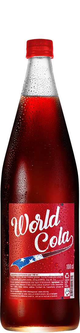 WORLD COLA est une boisson pétillante aux arômes de cola, rafraichissante et pleine de vitalité. WORLD COLA, Délicieux et Rafraichissant. Variante : Avec sucre & Sans sucre. Conditionnement : PET (30cl, 150cl) – VC (30,cl 50cl). Points de vente : Boutiques, glacières, GMS, CHR, bars, maquis-bars, maquis-restaurants, drômes, collectivités, fast-food, discothèques.